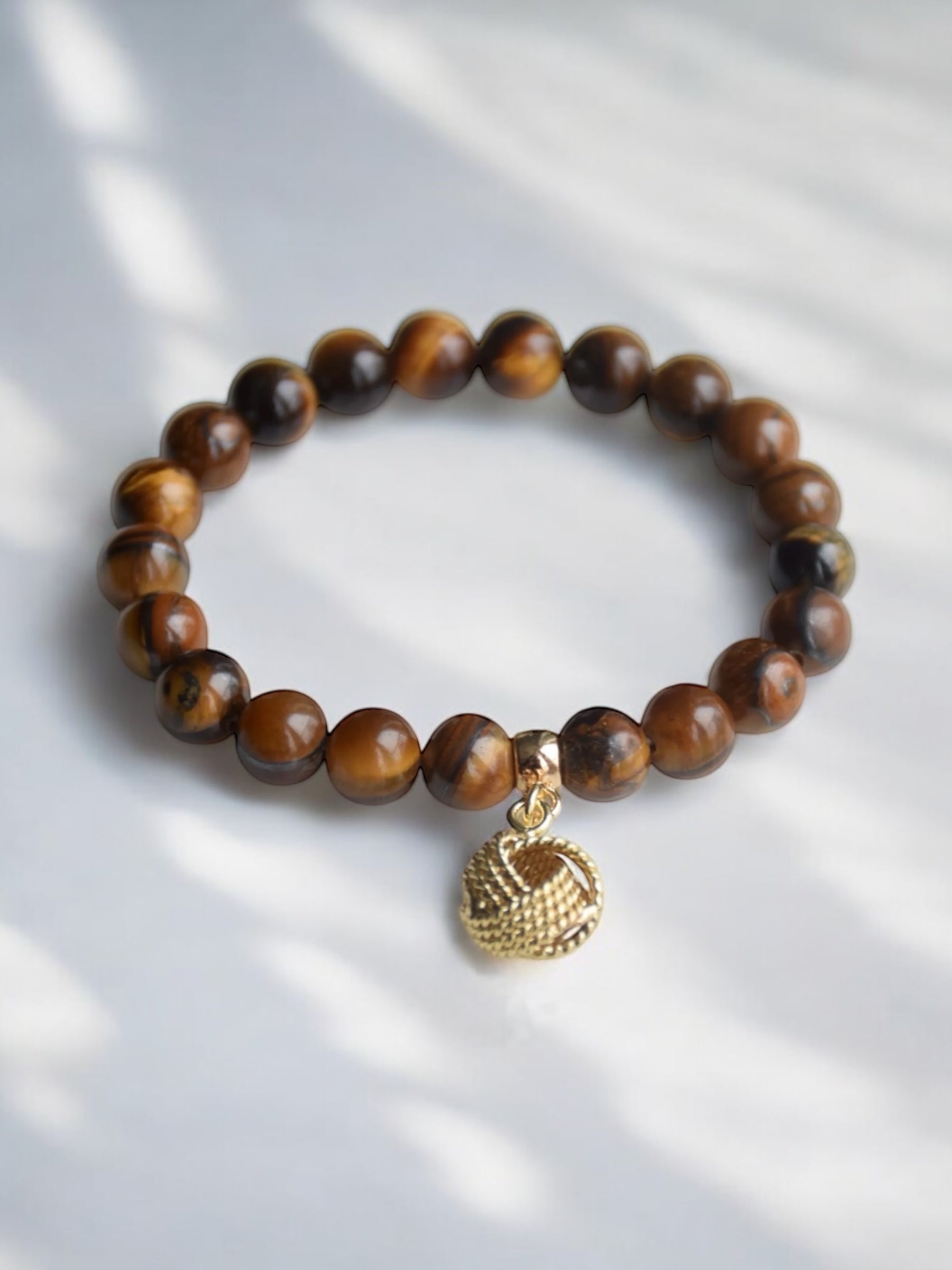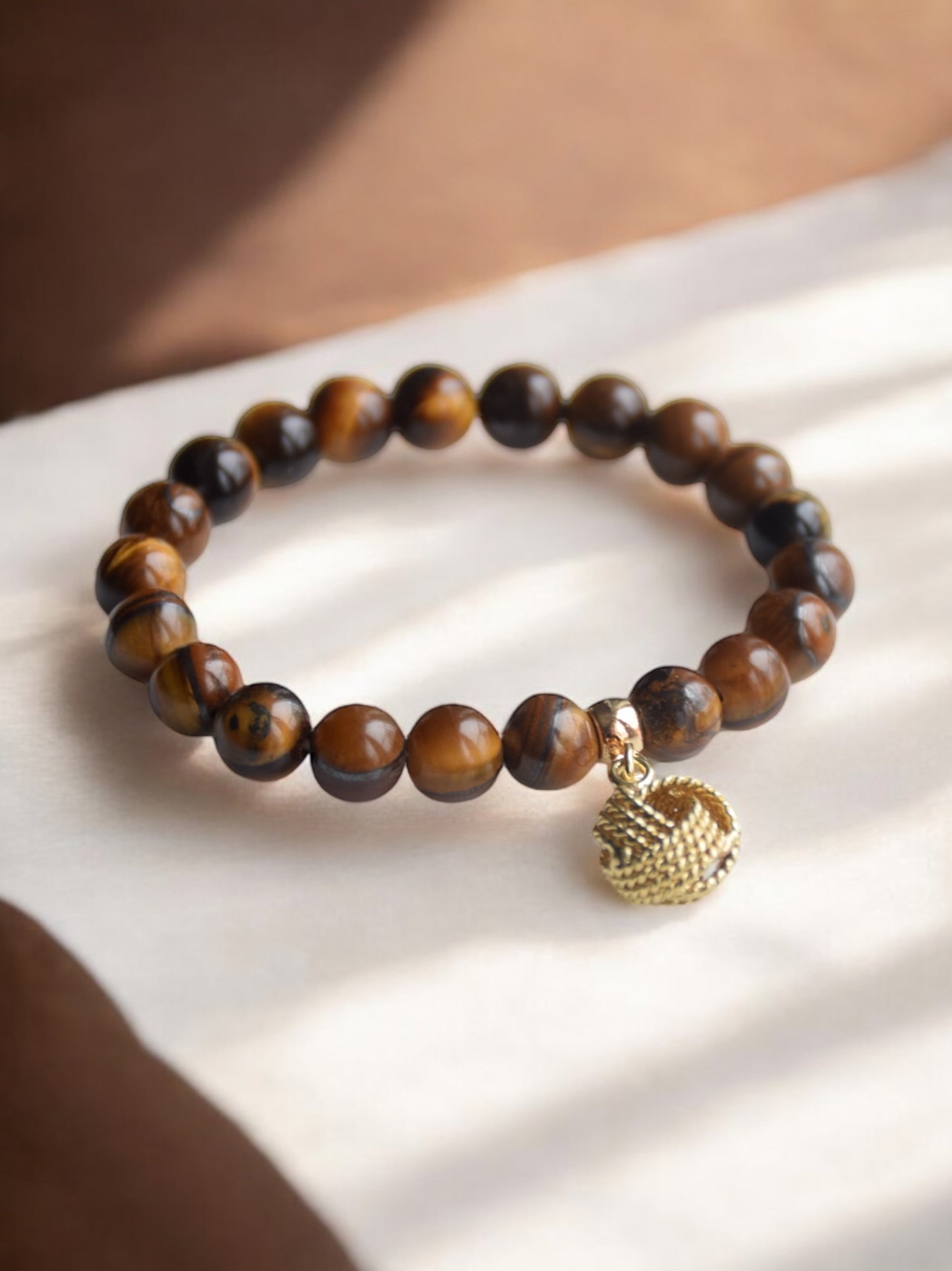 Material: Der Halbedelstein Tigerauge mit einem vergoldeten Detail in Form eines Knotens.