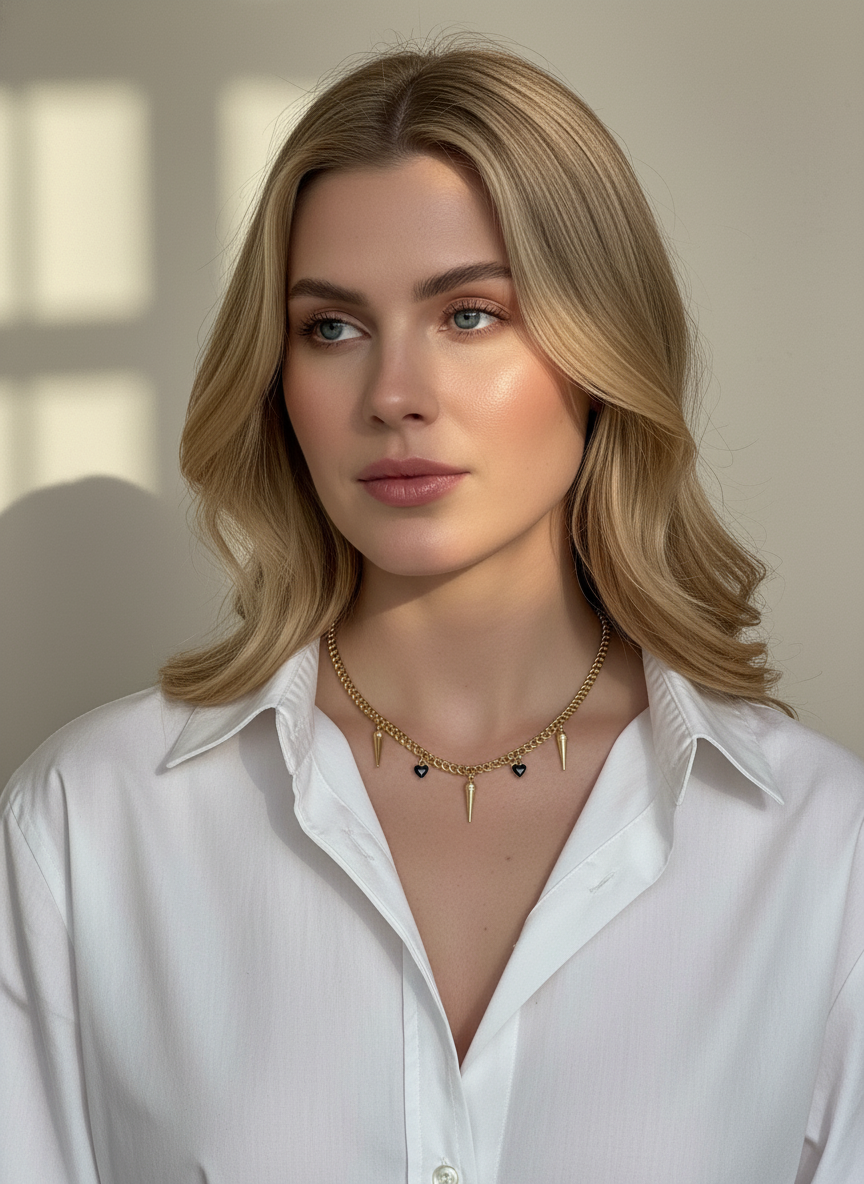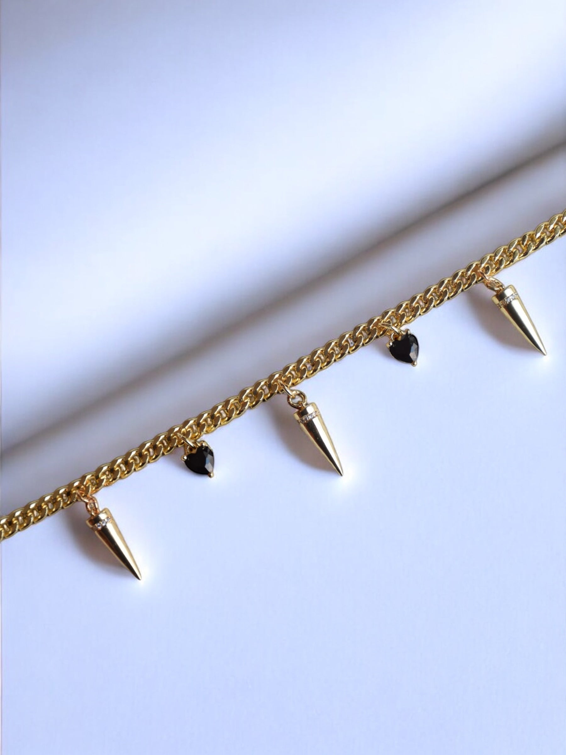 En klassisk pansarkedja i 24 k guldförgyllning med svarta hjärtformade berlocker och spikes. Ett halsband som man faller head over heels för om man gillar denna typ av stil. .