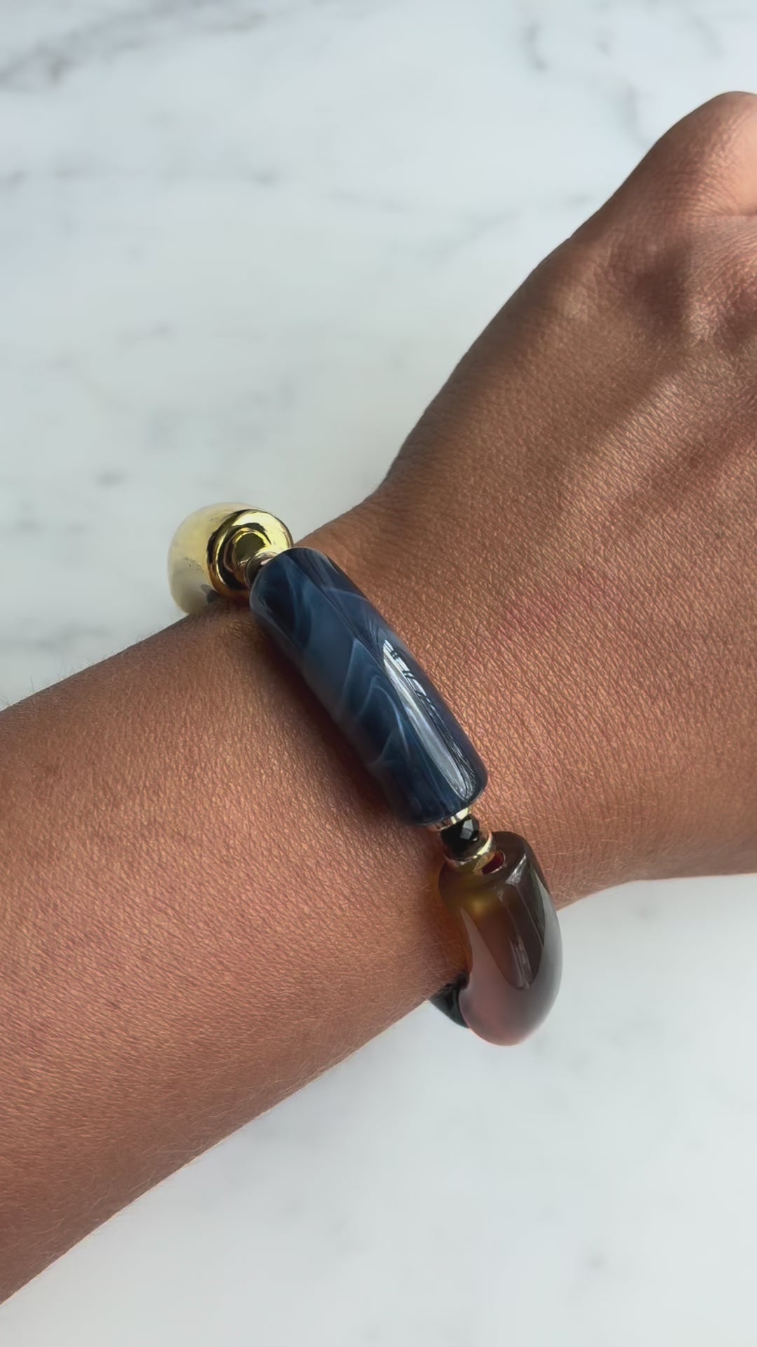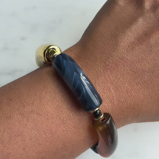 Material: Resin bracelet interspersed with gold-plated details and small abacus.