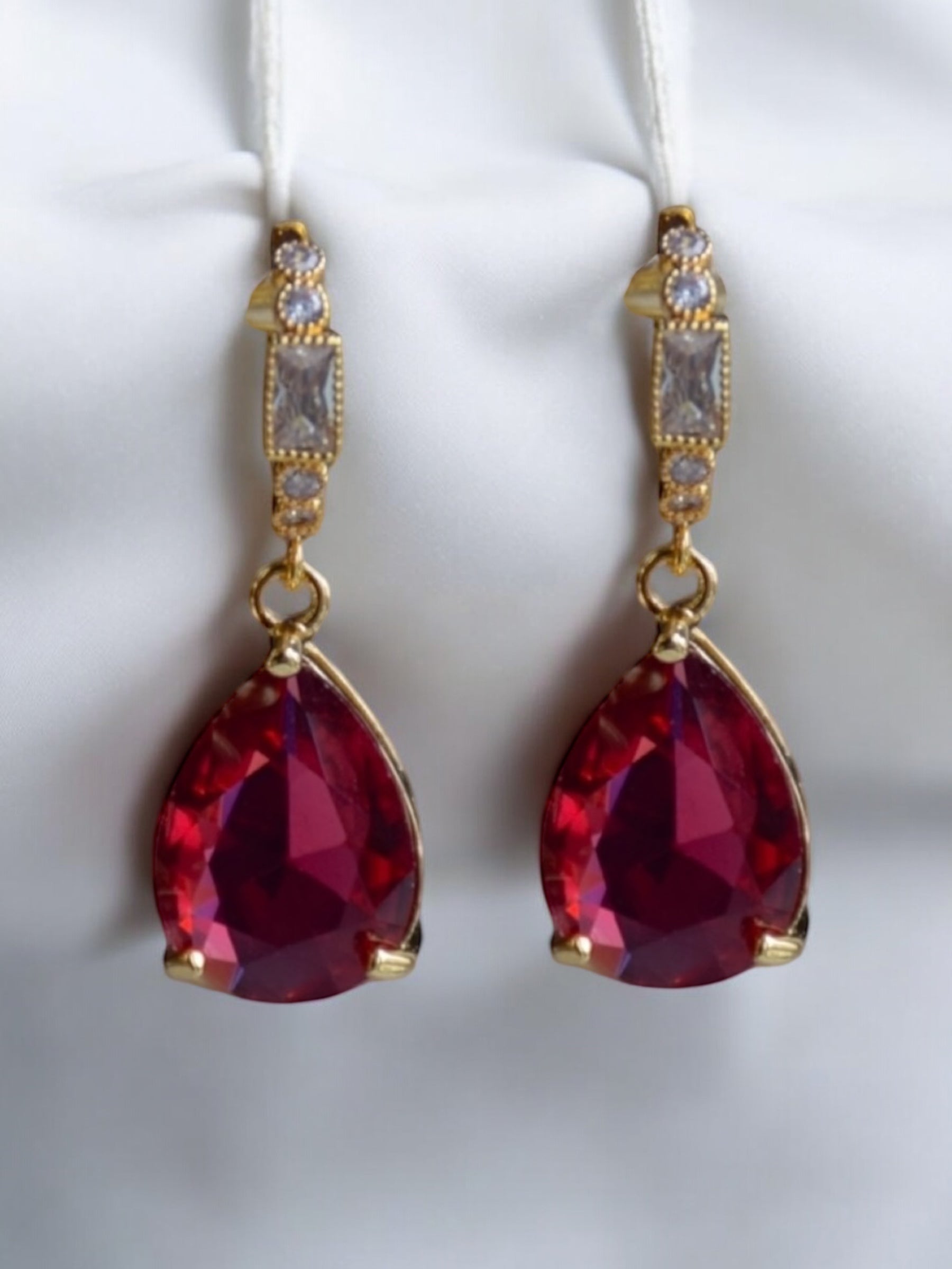 Material: Guldpläterade örhängen med en droppformad röd cubic zircon.
