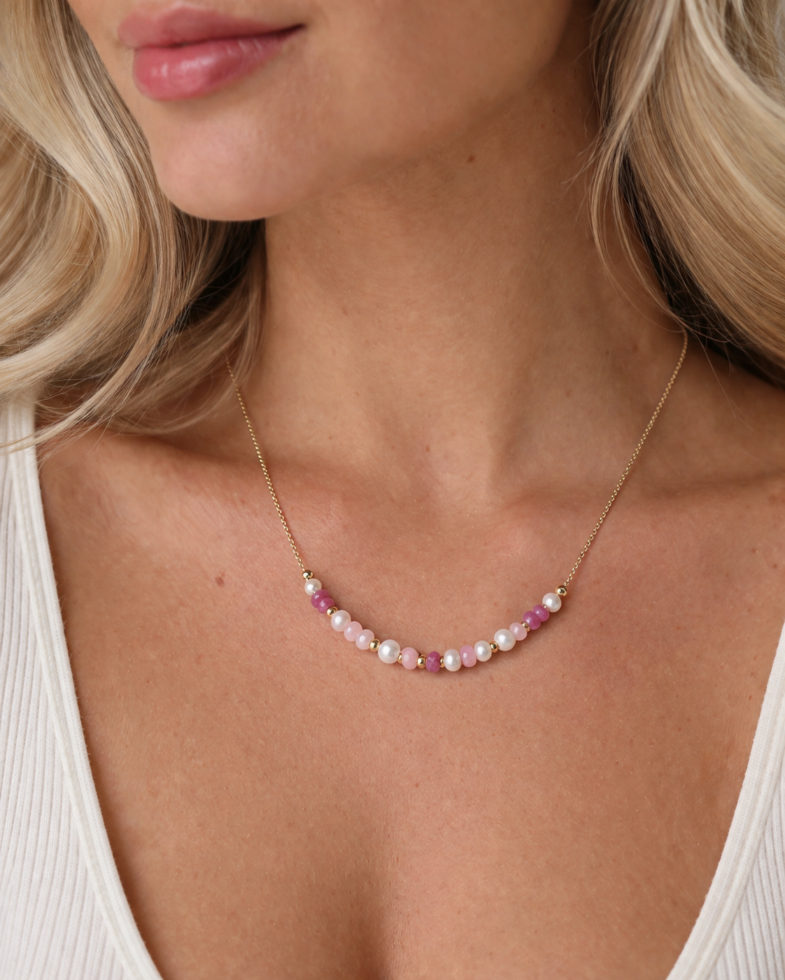 Låt våren ta plats med Cherry bomb necklace och macthande örhängen. Setet är uppbyggt kring en harmonisk kombination av sötvattenspärlor och ädelstenar i varierande rosa toner. Den nätta guldkedjan och stenarnas klara färger fångar ljuset vackert och ger en fräsch känsla. Ett hantverk med fokus på kvalitet och en tidlös färgskala som håller säsong efter säsong.