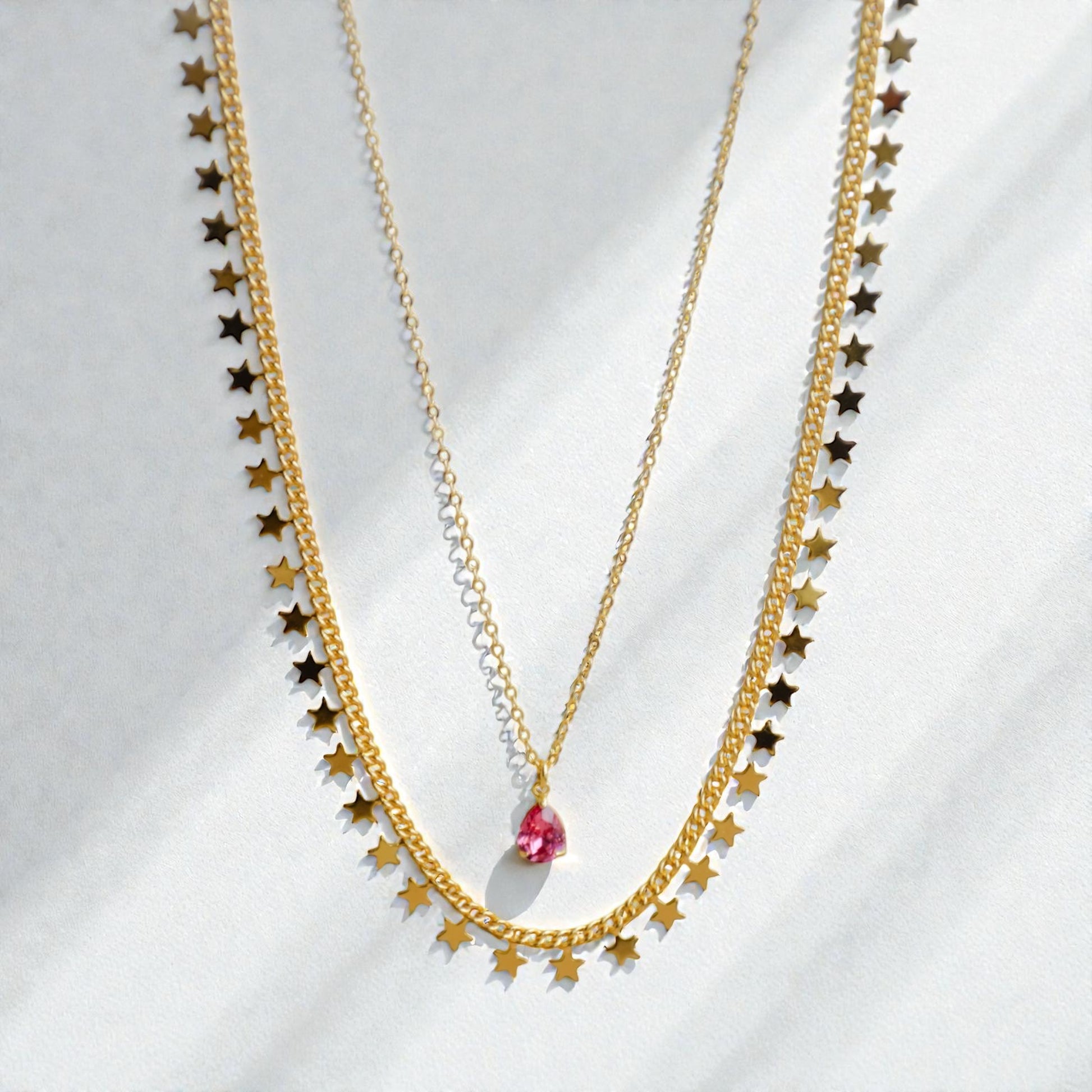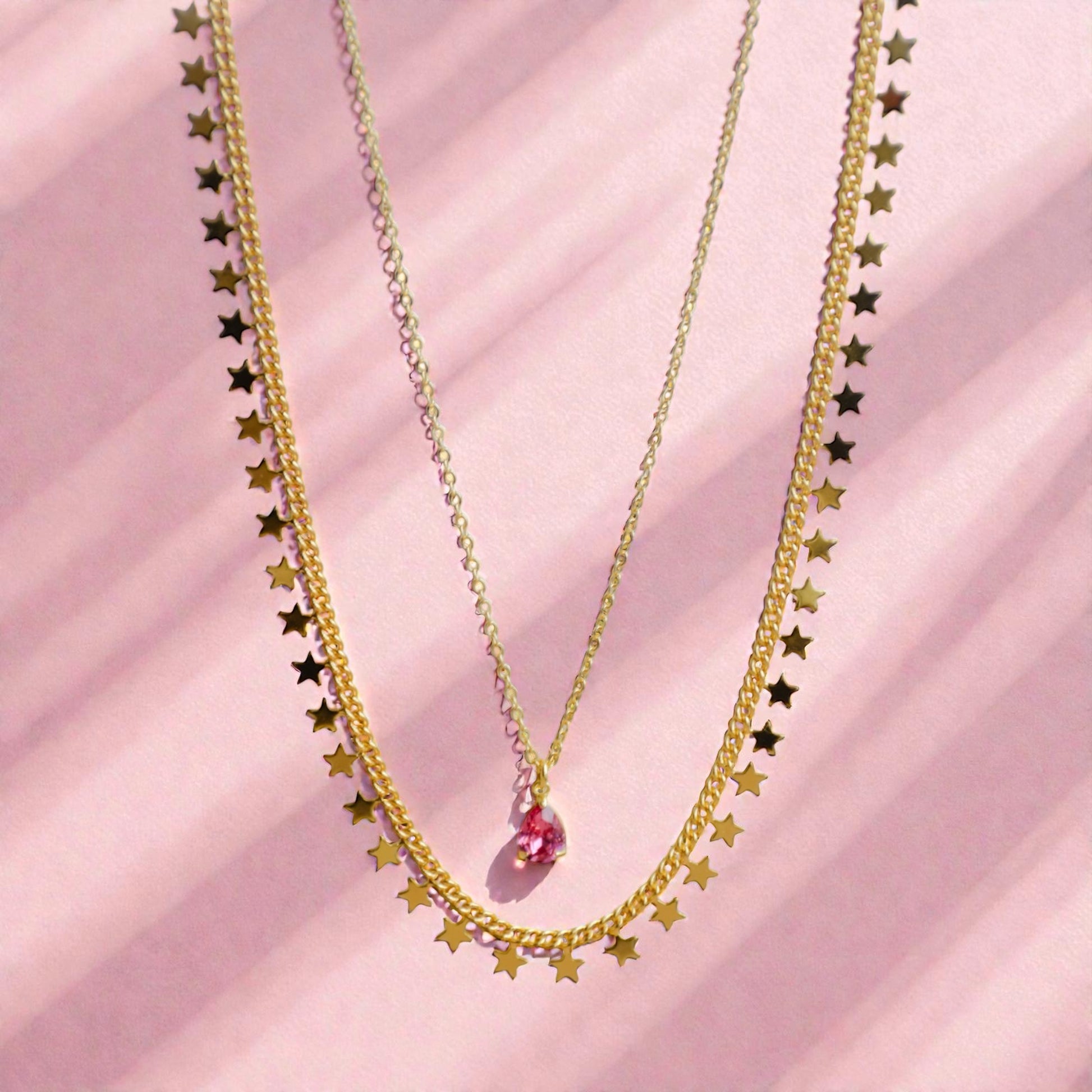 Material: 24 k guldförgyllda kedjor, den ena med stjärnor och den andra med en rosa berlock.