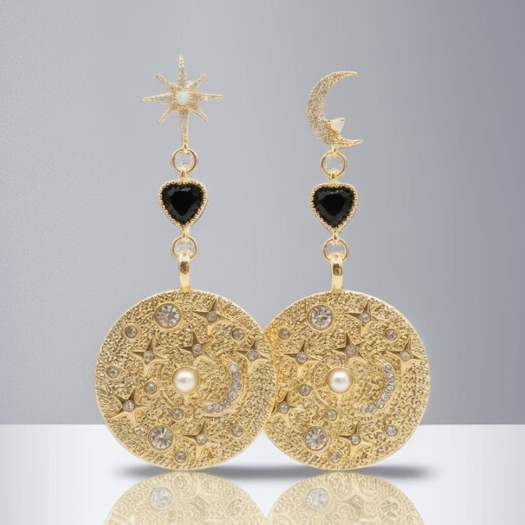 Material: Guldförgyllda örhängen med ett svart hjärta av cubic zircon och medaljonger med motiv från stjärnhimmeln.