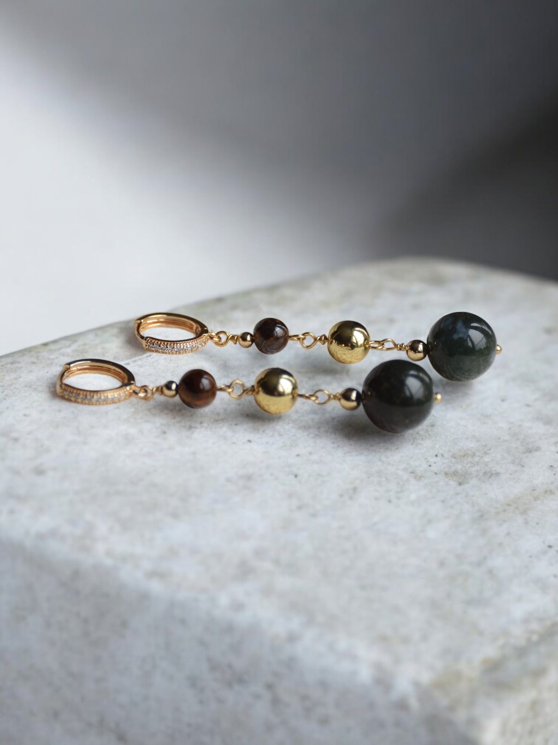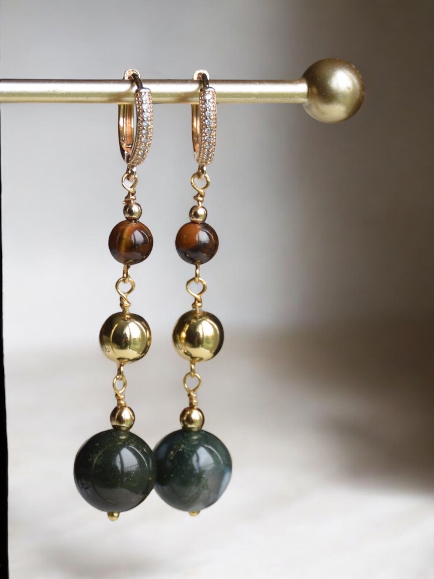 Material: 24 k guldförgyllda örhängen med olika halvädelstenar, mossagat och tigeröga.